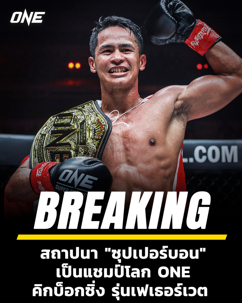 ข่าวมวย ONE ประกาศแต่งตั้งอย่างเป็นทางการให้ “ซุปเปอร์บอน ซุปเปอร์บอนเทรนนิงแคมป์” ยอดนักสู้วัย 34 ปี จากพัทลุง ขึ้นแท่นเป็นเจ้าของตำแหน่งแชมป์โลก ONE คิกบ็อกซิ่ง รุ่นเฟเธอร์เวต (145-155 ป.) นับแต่วันนี้เป็นต้นไป